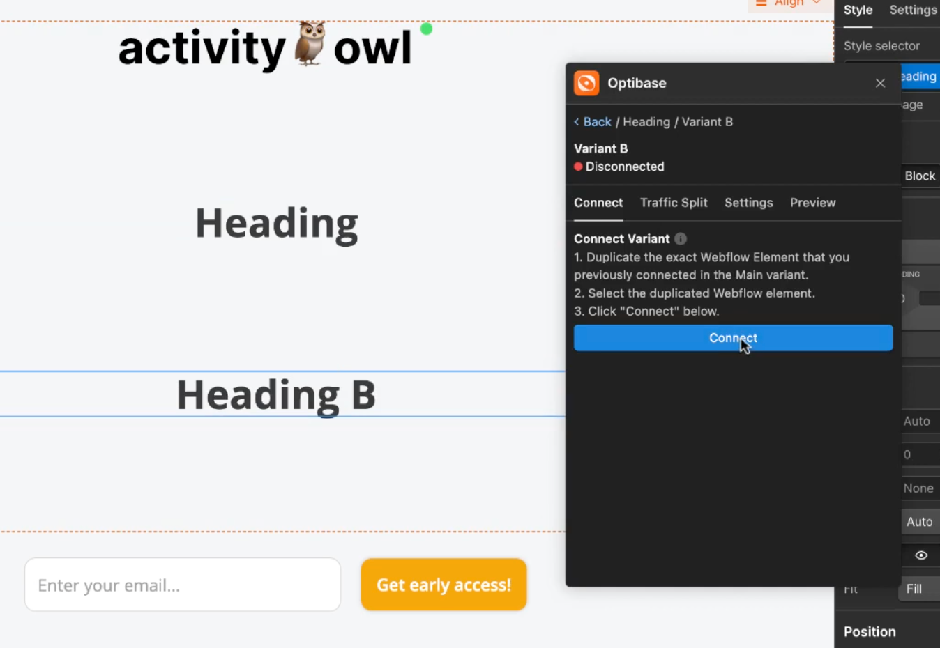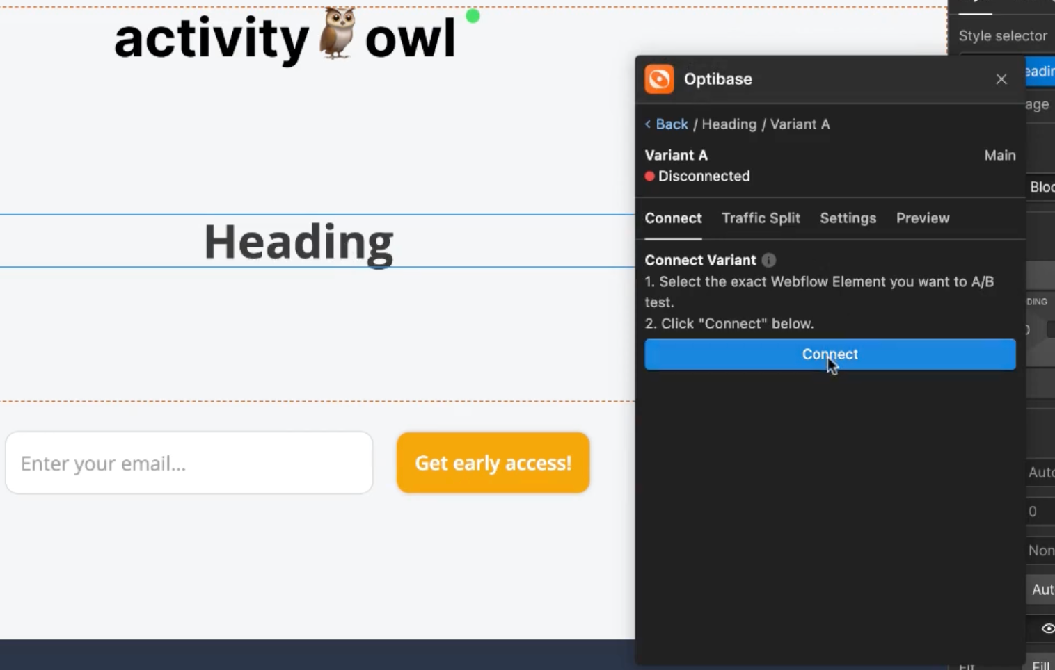 Name it Variant A. - Select the element you want to test directly on your Webflow canvas (e.g., the hero heading).